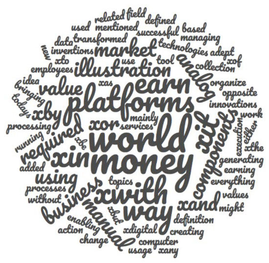 As can be seen, identified key topics were related to financial terms (“earn”, “money”, “value”), as well as terms commonly used to represent the antagonism of the digital and the pre-digital business landscapes, like “platform”, analog, or “x…”. Other key terms were distributed evenly, both digital-related (like “processing”) and unspecified (like “innovations”).