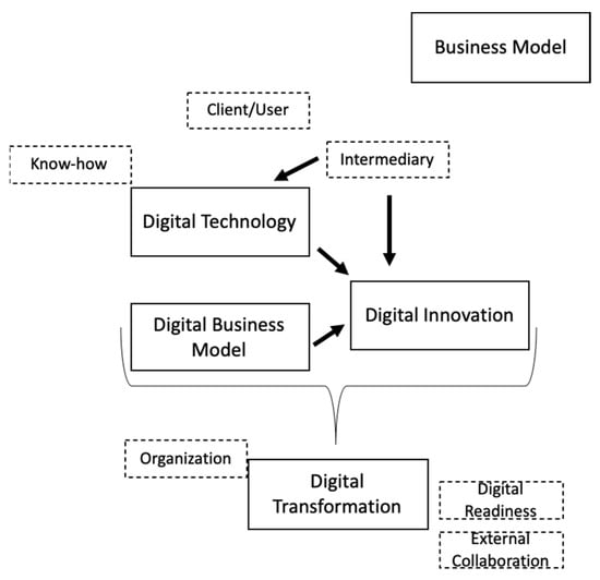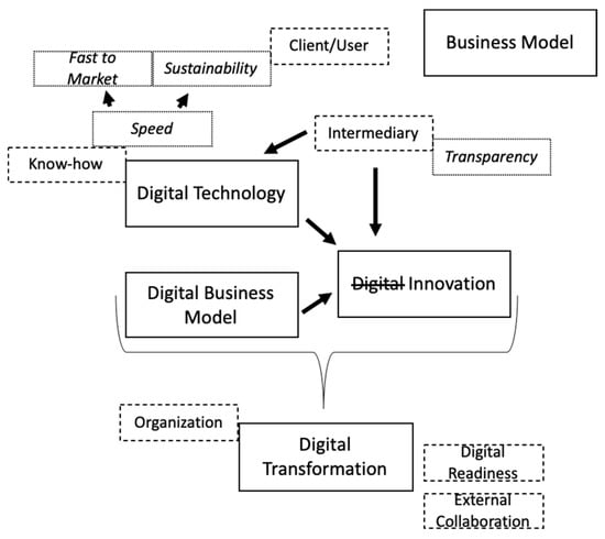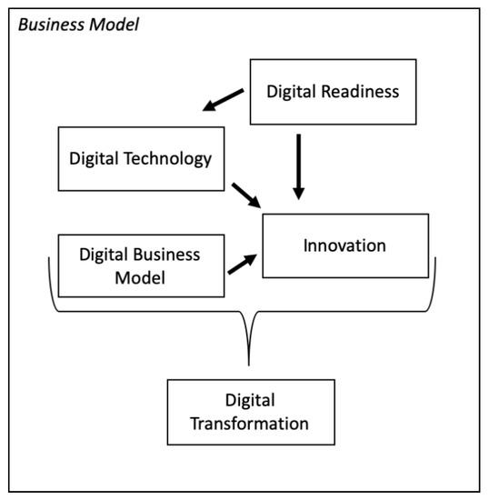 Embedded within the firm’s overall business model, the different digital terms and innovations thrive to eventually master the Digital Transformation [20,60] sustainably. Rather than being a step-in-process to Digital Entrepreneurship, Digital Transformation spans all relations within the digital framework. In the same view, Kaltum et al. [49] argue that Digital Transformation is the means to capitalize on everything related to “digital”. This extends the work of Yoo et al. [7] in that Digital Transformation does not only enable distinct firms to come together, but also all activities within firms relating to digitalization and, eventually, innovation within their respective business models, transcending previously defined inner-firm organizational boundaries, as agile methods upended previously fixed innovation approaches [61]. Innovation in itself lies at the center of Digital Technology and Digital Business Models [62], with Digital Readiness surfacing as an organizational enabler within the conceptual framework of “digital”. The results also demonstrate that, independent of any “digital”-related activities, activities need to be closely aligned and adjusted according to each firm’s individual business model [2,15,17,63]. In this way, it is ensured that digitalization and, ultimately, Digital Transformation are sustainable and not only for digitalization’s sake and without any effect or reasoning for firms’ underlying (Digital) Business Models.