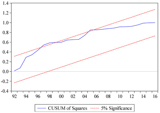 Table 8 reports the consequences of diagnostic tests of the ARDL model. The estimated outcomes of the Breusch–Godfrey (BG) method verified that our ARDL model had no problem with serial correlation, while the results of the Breusch–Pagan–Godfrey (BFG) method verified that there was no problem of heteroskedasticity. Figure 1 and Figure 2 display the plots of the cumulative sum of recursive residuals (CUSUM) and the plot of cumulative sum of squares of recursive residuals (CUSUMS), which show that the ARDL model was stable over the sampled period.