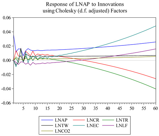 The basic purpose of this approach is to check the evolution of variables in response to a shock to one or more variables in the model. This practice checks the behavior of variables at various periods and makes policy suggestions based on the responses of variables at different points of time. Using the data of 1983–2016, the impulse response function (IRF) under the VECM approach (shown in Figure 3), was twisted in nature from the first reply of the LNAP until the 23rd period. The first 26 periods had a smooth tendency for forecasting and regressing (except LNTW and LNEC), while trends varied for all variables from the 27th to the 60th period. Overall, the variations in response to shocks indicate that the connection of all variables was more significant in the long term than the short term. In the same line, the pattern of this relationship varied after 27 periods for most variables. Thus, the IRF validates the association of all variables with agricultural production, and indicates variations in this relationship that confirm the previous outcomes from the main models.