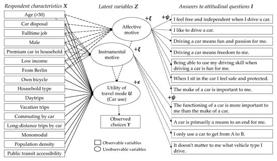 Thus, far, in the “base” model we only considered observable variables to describe the choices. The OHCM provides a framework to incorporate unobservable, latent variables. In the following, we describe the setting of the OHCM that is later being used. The indicators Table 1 were used to gain information on the latent variables describing people’s motive for car use. By adding a latent variable model to the choice component, we were able to include these indicators. As a result, the model contained a group of structural equations and measurement equations. In the following, these equations are described in more detail.