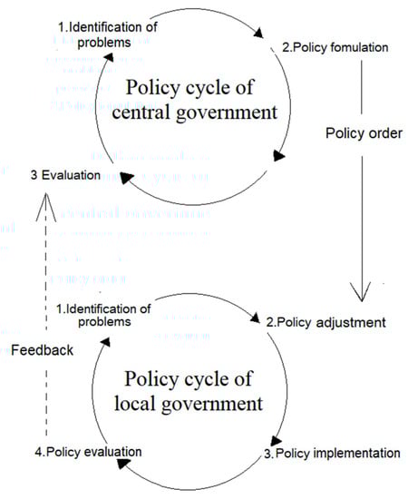 In order to better understand the water governance mechanism in reality, this study develops a “double wheel” policy cycle model based on the traditional ‘‘one wheel’’ policy cycle model, although the latter is mainly used in water policy research [15]. The traditional policy cycle consists of four parts: problem identification, policy formulation, policy implementation and evaluation [16,17]. However, because of the regional diversity in China, the central government usually decentralize parts of decision-making power to the local government to make policies better adapted to the local situation. Therefore, the problem definition process occurs at the local government level in fact, and policy adjustment is allowed and encouraged by the centre. This subtle trait cannot be reflected in the classical policy cycle model. This paper argues that the policy cycle of water governance has a ‘‘double wheel’’ structure, which means the policy cycle occurs at the levels of both the central government and local governments. The policy cycle of the central government consists of three parts (problem identification, policy formulation and evaluation), while the policy cycle of the local government focuses on problem identification and policy adjustment, policy implementation and policy evaluation.