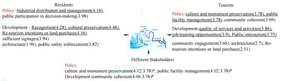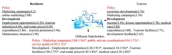 As a result, stakeholder perceptions of employment opportunities, salary income, tourist facilities, real-estate prices, and medical services differed, causing divergences (p < 0.001), as shown in Table 6.