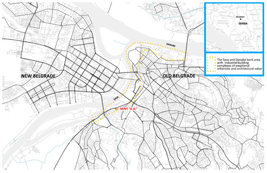 At the beginning of the development of industrialization, industries were located on the very outskirts of city centers. The wider area of the case study—Mint “A.D.” (Figure 1) —confirms this, where numerous industries were located in the area stretching from Belgrade Fortress (the old fortified city) to Ada Ciganlija (the Belgrade Lake).