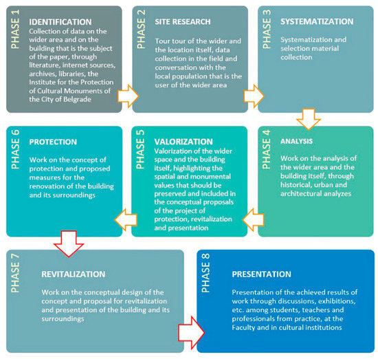 For many years at the University of Belgrade— Faculty of Architecture, students of master and integrated academic studies of architecture, within elective courses in the field of protection, revitalization and study of architectural heritage, have the opportunity to expand their knowledge acquired in basic academic studies in architecture history and art. Through various topics and types of architectural heritage, students have the opportunity to apply their acquired knowledge in projects of revitalization and presentation of historical spaces through concrete examples (Figure 3). In addition to various topics related to the ancient and medieval heritage in Serbia, students are given tasks and topics related to industrial heritage in Belgrade. During previous years, students have given very important ideas related to the renovation, revitalization and presentation of important buildings of industrial architecture, which are in very poor condition today, such as the Foundry “Pantelić” in Zemun and the Art Foundry “Skulptura” in Belgrade [56,57].