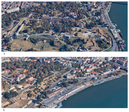 Belgrade from bird’s eye view. (a) View of the Belgrade Fortress, (b) View of the Beton Hala and an urban neighborhood Kosančićev Venac. Source: Google Earth.
