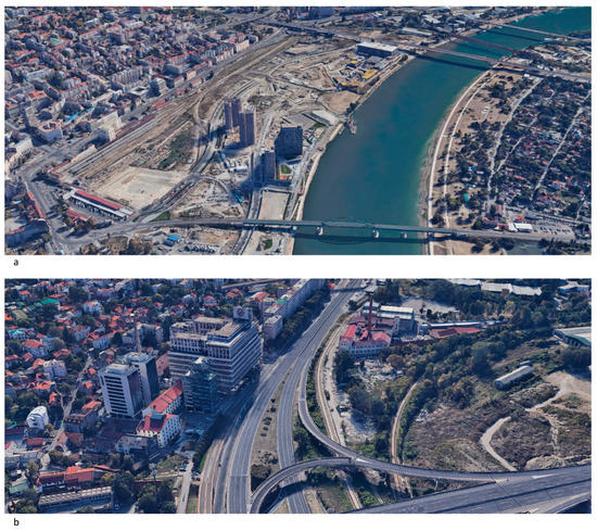 Belgrade from bird’s eye view. (a) View of an urban renewal development project “Belgrade Waterfront”. (b) View from the Mostar interchange at the Blvd. Vojvode Mišića. On the left are the Old Mill/Hotel Radisson Blu and State Printing House/“BIGZ” and on the right is the “Milan Vapa” factory. Source: Google Earth.