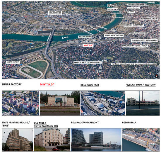 The researched case study of the Mint “A.D.” is not characterized by high authenticity in an aesthetic and specific architectural style sense, but it is highly authentic in terms of specificity of the natural environment (estuaries, riverbanks of the Sava and Danube, Ada Ciganlija Lake). On the other hand, the built environment is one of the most authentic parts of Belgrade (small fishing cottages on the banks of the Sava and Danube; Belgrade Fortress—the Old Town; the oldest zone of Belgrade—Kosančićev Venac; Belgrade Fair—a miracle of architectural construction technologies from the 1950s, which was declared a cultural monument; as well as numerous industrial facilities in the area). Based on the analysis of the current situation and insight into the General Urban Plan of Belgrade (GUP), the location of Mint “A.D.” is not integrated into the planned urban development of the wider area of this zone [84].