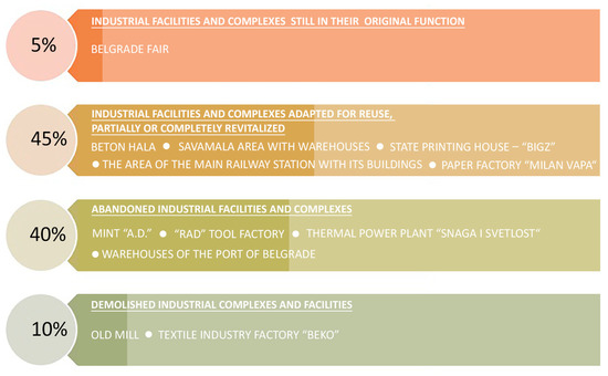 Industrial complexes and buildings located along the Sava and Danube riverbanks, according to the current state of functional representation, can be divided into four groups (Figure 7). The first group consists of complexes and buildings that are in good condition, whose primary function is still active. The largest group consists of complexes and buildings that have been revitalized and whose functions are mainly related to cultural and educational facilities, business and catering. These complexes and buildings have partially preserved their authentic appearance, with certain interventions, in order to adapt to the new purposes. The third group refers to industrial complexes and buildings that are out of primary function and in very poor condition. They are ruined and abandoned, but contain numerous values that should be preserved in future revitalization and presentation projects. The last group consists of complexes and buildings that were demolished in order to build new structures, thus, permanently losing the authenticity and integrity of these units.