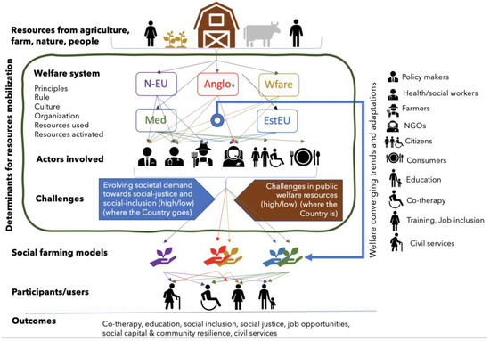 According to the mixture of welfare models and perspectives focused on by the stakeholders involved, as well as their positions and (un)satisfactory starting situations, the actors embedded in diverse environments can be differently engaged to analyze their reality, act to build coherent and new answers to emerging needs, and mobilize existing resources according to social innovation models. At the same time, efforts are commonly channeled along diverse goals and outcomes in connection with the main principles conditioning existing welfare models. Thus, different actors—always with strong ethical motivations—support specific goals in line with their visions, competences (in agriculture and in the social health sector), attitudes, and recognized priorities.