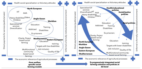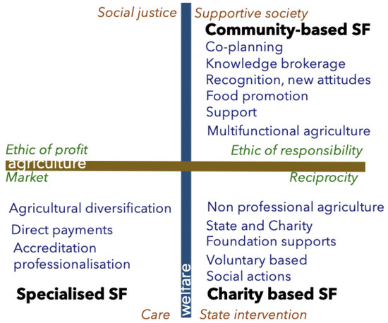 - Community based social farming, where farmers are actively involved in local new networks where public and third sector social workers are also active. Farmers act on a voluntary basis, with little to no direct economic recognition. Direct state intervention is very limited due to funding scarcity. Agricultural processes are mainly run professionally, as economic sustainability still depends on them. Collaborative nets are organized, and the local society and consumers actively reshape their relationships, placing more emphasis on ethical food [71,72] and acting reciprocally with local farmers (e.g., using gifts) to facilitate the involvement of disadvantaged members of society. On a voluntary basis, farmers provide new opportunities to disadvantaged people by including them in everyday agricultural processes. Farming activities—agricultural as well as animal husbandry—remain food-business oriented but also support social opportunities for the participants involved. In this case, agricultural resources are mainly valorized for social health uses by strengthening their multifunctional aspects and the co-production of food and social services at the same time. Farmers work in collaboration with the social health sector (the public or third sector) and, in the meantime, gain evidence and recognition in the local society and by consumers. In this model, consumers are willing to recognize social farmers’ roles in society and pay new attention to the food they produce. These solutions are mainly developing in Mediterranean countries but, due to growing economic constraints, are also growing in Northern European countries, as well as in Eastern European countries.
