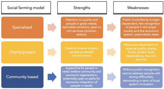 These three social farming solutions illustrate the diversity and meanings that inform social farming practices, at least in the EU. Each model presents its own strengths and weaknesses in the outcomes for the people involved and in local societal organization and future sustainability (Figure 3):