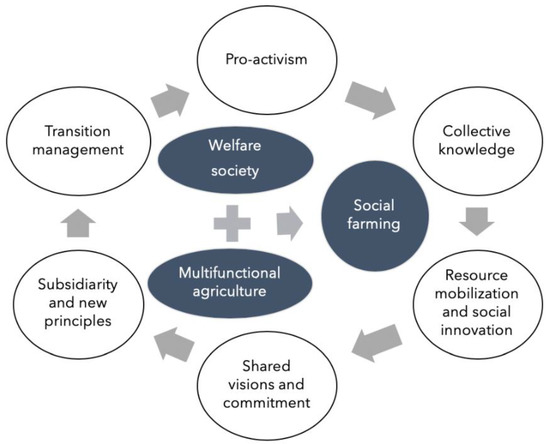 Social farming evolution can be observed in continuity with the main discussion summarized earlier. On the one hand, social farming evolution is related to the organization of more flexible and enabling contexts linked to the use of nature and agricultural-related processes and activities; on the other hand, from the perspective of social innovation [67,68,69,70], it re-embeds the rights and opportunities of disadvantaged people in the whole of society by organizing new public–private networks for the provision of potentially effective and more efficient services, both for different human targets and for diverse urban–rural areas.