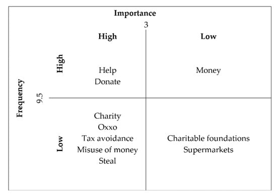 The top-left quadrant (central core) represents the elements with high frequency and high importance. For this quadrant, the elements donate and help were included. On the other hand, the top-right quadrant represents the elements with high frequency but low importance. This quadrant is known as the first periphery, which encompasses the secondary elements of the social representation. During the analysis, only one element was identified as belonging to the top-right quadrant: money. The bottom-left quadrant represents the elements with low frequency and high importance. Also referred to as the “contrasting zone”, this quadrant “… can reveal the existence of a subgroup carrier of a different representation” [] p. 30. This quadrant consisted of five elements: charity, tax avoidance, misuse of money, steal and, Oxxo (Mexican convenience store). Finally, the bottom-right quadrant represents the second periphery, in which two elements with low frequency and low importance were identified: charitable foundations and supermarkets.