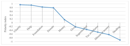 Regarding the polarity indexes (Table 2 and Figure 2), the results display an even distribution of elements assessed as positive and negative by participants. The elements perceived as positive by millennials were charity, help, charity foundations, donate, and money. On the other hand, the elements perceived as negative were Oxxo, supermarkets, tax avoidance, misuse of money, and steal. It is worth mentioning that most of the elements evaluated with positive attitudes by millennials were placed in the central core (top-left quadrant) and the first periphery (top-right quadrant). In contrast, most of the elements evaluated with negative elements were located in the contrasting area (bottom-left quadrant). In the case of the second periphery (bottom-right quadrant), charitable foundations had a positive valence, while supermarkets had a negative valence.