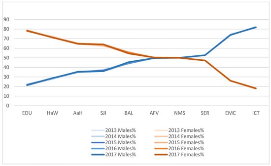On the other hand, numerous research shows that cultural differences between genders have driven, to a lesser extent, women towards enrolment in technical careers [7,8,9,10], having declined their presence in the last two decades [11,12,13,14,15]. Some of these studies have pointed out that technology and computers are often considered male tools [16,17,18,19,20]. One of the possible factors of such rejection may be that women use video games less for their leisure, being one of the gateways to technology [17,21,22,23,24,25,26,27,28]. Reasonably, the digital gender gap may be related to the low enrolment of women in technical careers. As can be seen, Table 1 and Figure 1 reflect Eurostat data [29] regarding the distribution of students in the undergraduate studies by field of study and gender, appreciating that women decide on careers related to health, education, and the services sector, while men decide on technical careers such as engineering and computer science, where women reach just 10%.