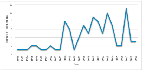 Based on our data set, the first publication on the subject of corporate citizenship was published in 1969. Up until the year of 2003, one to two papers were occasionally published at irregular intervals. Up until and including 2003, only 13 (10.58%) works were published. In comparison to previous years, in 2004 the number of publications increased noticeably to eight. From here on, the number of publications fluctuates. The years 2006, 2015, 2016, 2018, and 2019 are each marked with one to three publications. The strongest years were 2004, 2010, 2011, and 2017, with at least eight to eleven publications. In the middle range are the years 2005, 2007, 2008, 2009, 2012, and 2014, with four to seven publications. Figure 1 shows the chronological course of the publications. Those years that do not appear on the timeline in the illustration have no publications. This is particularly true for the long period between 1971 and 1994. From a chronological point of view, it shows that the first 35 years of corporate citizenship research were characterized by few publications, which changed in 2004. Even if more has been published since that year, a certain instability can still be seen as there are always periods with little publication activity. It remains to be seen if the COVID-19 crisis [77] will have an effect on the further development.