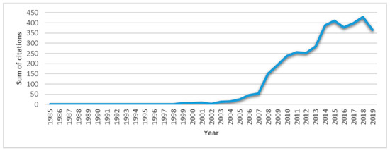 With regards to the number of citations of the respective years, it is striking that a similar picture emerges here. A low-citation phase can be stated from 1969 to 1997. Figure 2 shows the sum of the citations (y-axis) in relation to the respective year (x-axis). For reasons of legibility, the illustration does not begin before 1985. As of 1998, the number of citations increased for the first time, reaching a double-digit figure for 12/15 in 2003/2004. After this second phase of the initially slow increase, a more rapid increase in citations can be observed from 2005 (26 citations). Ultimately, a peak of 428 was reached in 2018. What is striking here is the exponential increase in citations since approx. 2005, which has generated a relatively constant increase in the number of citations. Even if slight drops (e.g., 2016, 2019) can be seen, they ultimately do not detract from the rising overall picture.