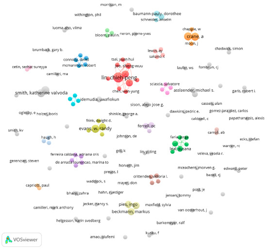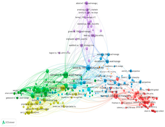 The co-citation analysis shown in Figure 4 only includes publications that have been cited at least twice (68 publications) in order to skip the less influential publications for better clarity. The analysis resulted in 454 items, grouped in seven clusters. Due to the limited space, not all items are visible. The items include not only the 68 corporate citizenship publications from our data set, but also other publications, such as Wood [79], which are cited together with them. Items that are close to each other have a comparatively high common citation rate [40], which suggests a certain proximity of content. The graphic representation shows a tightly packed picture of co-citations. Some circles, which are represented as one item here, actually consist of more than 20 items in the original presentation). The seven clusters are not strictly distinct from each other but mostly interrelated. The size of the circles represents the total link strength, which indicates how many links each item has. The individual circles are color-coded according to publications. The highest values are shown by Carroll [80] with 712, Maignan [81] with 551, Wood [79] with 544, and Matten [37] with 532 citations. Except for the latter publication, none of these publications are part of the original data set. Accordingly, the publication with the highest number of citations has only the fourth highest weighting and thus the fourth highest value.