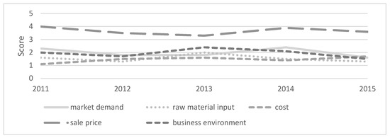 According to the statistics of the Taiwan Institute of Economic Research in 2016, as shown in Figure 1 [34], from 2011 to 2015, the manufacturing demand, raw material input, cost, sale price, and business environment are five dominating indicators. There is a significant increase in cost, whereas other indicators are relatively lower. The scores of these four low-level indicators are even lower than five years ago. The data clearly show that the cost of manufacturing is increasing, and it is also impacted by other indicators or unknown factors. These unknowns may affect each other. Thus, it is worth to explore further to avoid the overall economic downturn. It shows a need to guide the effective strategies and policy directions, which can quickly improve the environmental system of the entire country, the structure of the industry itself, and enhance the overall competitiveness.