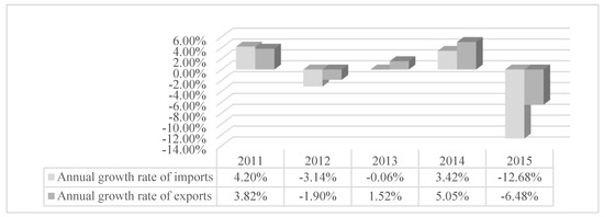 The growth rate of the import and export of Taiwan’s manufacturing industry from 2011 to 2015 is shown in Figure 2 [34]. The overall global recession in 2015 impacted Taiwan’s manufacturing industry, which stopped growth and led to a substantial negative growth. Currently, it is not only due to external challenges, but also internal business operation has experienced great difficulty to survive, excel, and remain competitive in the global market.