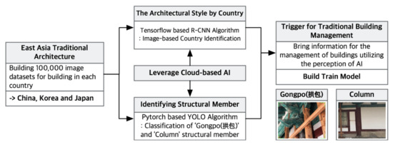 Two types of form recognition algorithms were used for building analysis. A region-based convolutional neural network (R-CNN) was built in TensorFlow for object recognition and was used to classify images of traditional buildings in East Asia by country. Redmon’s you only look once (YOLO) algorithm [7] was used to detect the structural members of columns and gongpo in Korean architecture. The form recognition process acts as a trigger for importing related data and is a basic technology for differentiating assembly-style traditional buildings. A training model was developed to learn the traditional buildings of each region and the features of structural members. A vast number of test images were used to verify the training model. In this study, photographic data were used to classify the features of building styles by country. The scope was limited to recognising the forms of columns and gongpo and developing a classification model.