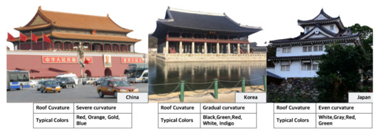 As an example of the different roof shapes of the three countries, the Yu Garden Pavilion in China has rich ornamentation and a highly curved roof [12]. In Japan, the roof of Izumotaisya has a steep slope and even curvature. In Korea, the pillars of Munmyo Daeseongjeon are not standing in a straight line, the centre is bent slightly inward, and the entire building forms a curve.