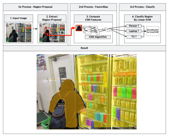 R-CNN combines region proposal with a CNN structure and is executed as follows.