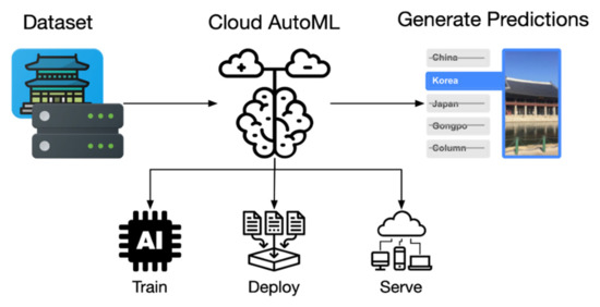 Cloud AutoML is a deep learning optimisation method that allows even users with minimal machine learning [18] knowledge to customise high-quality models to fit their business needs through the Cloud Vision API. Cloud AutoML provides a graphical user interface (GUI) environment that can be used to train, evaluate, improve, and distribute a model based on the user’s own data. Therefore, custom machine learning models can be created on a web console [19]. Because it is completely integrated with other Google cloud services, users can use a consistent access method for all of Google’s product lines. In Cloud AutoML, if a grouped and labelled dataset is placed in AutoML, the train, deploy, and serve processes are performed internally. The serve process can be used to publish a platform created by deep learning on all platforms including webpages, mobile devices, and computers, as shown in Figure 6. Thus, it provides a work environment with excellent and immediate scalability. Because Cloud AutoML supports Python and REST (Representational State Transfer) API for model generation, it can be used to create application programs. Once a deep learning model has been built, realising practical utilisation is simple. Therefore, it can be used intuitively in needed areas, and feedback is possible. The biggest advantage is that a model can be made smarter continuously and gradually after development by using data results with the user’s approval. The traditional buildings classification model requires specialised knowledge as reference data for deep learning. AI is used to obtain desired feature points within the image by itself, and the points are reviewed with non-training data to increase the accuracy further. Thus, a deep learning model can train itself in real time and improve its own performance [20].