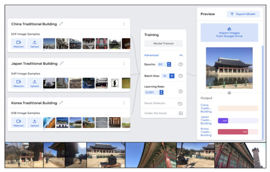 Figure 8 diagrams a dataset in which images have been grouped for classification and labels have been applied. This was done with Google Teachable Machine, which is a cloud-based object-recognition platform that can easily construct datasets to popularise AI. However, the platform can only be used for specific image classification tasks without specifying the deep learning algorithm. This limits its ability to perform intermediate deep learning tasks such as image calibration and weight adjustment. For a simple classification test, 1500 images were used. The epoch value was set to 50 (i.e., the training process was repeated 50 times), and the batch size was set to 16. The batch size is the number of hidden layers and refers to the degree of resolution. In other words, the features of an image are decomposed into 16 stages and analysed. A real-time test was performed on Gyeongbokgung Palace in Korea. The analysis results showed a 75% probability that it was a traditional Korean building and 25% probability that it was Japanese.