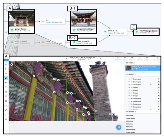 First, 16,478 traditional buildings-related data were masked (A in Figure 9). The deep learning algorithm (B-2) was combined with the masking data (B-1). The model was then built (C), and the type classification and location recognition tasks were performed. The number of images was increased by a factor of four by stretching, resizing, and distorting each image. This transformation task is a special training that allows the model to recognise objects when viewing images with various perspectives. The image data were masked and labelled on Supervisely, but a personal Linux server had to be prepared to compute the deep learning algorithm. Because Supervisely is a free service, it is structured so that personal hardware is needed to create an actual model. The basic requirements of the deep learning algorithm were a Linux operating system and Nvidia 1080 Ti professional-grade graphics hardware.
