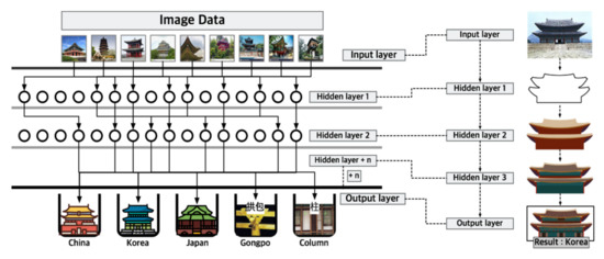 Finally, the calibrated variables were used to set the number of hidden layers. As shown on the right side of Figure 10, an image of Gyeongbokgung in Seoul [24] was inserted in the input layer. Then, the outlined part was extracted in hidden layer 1. As the layers increased, image elements were split gradually to create samples for analysis.