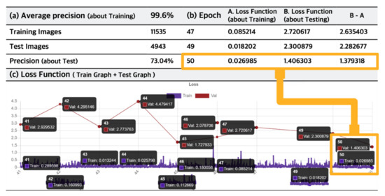 The performance of the deep learning model was analysed. Firstly, the model performance with R-CNN was analysed. For classification, 968 data were selected and transformed to increase the size of the dataset fourfold to 3872. The deep learning model was trained 50 times with 70% of the dataset. The training precision was 93.8%. The remaining 30% of the dataset was used for testing.