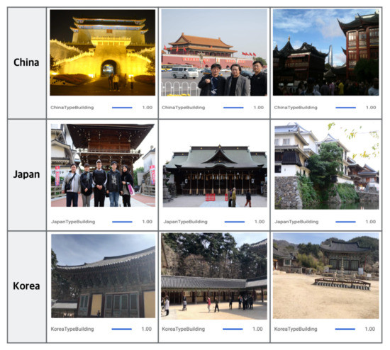 Detailed analysis showed that the images were correctly classified at rates of 93% for Japan, 77% for China, and 95% for Korea. In keeping with the principle of garbage in garbage out (GIGO), the accuracy should increase further with the number and quality of images in the dataset. As shown in Figure 11, the performance was limited by the images used in this study. The accuracy can be increased by providing clearer data or increasing the volume of data. As discussed in the next section, experiments were performed on 30 images simultaneously, and the results showed that the model correctly classified Chinese buildings even when images were dark and unclear. Ninety images were individually tested, and no error probability was observed.
