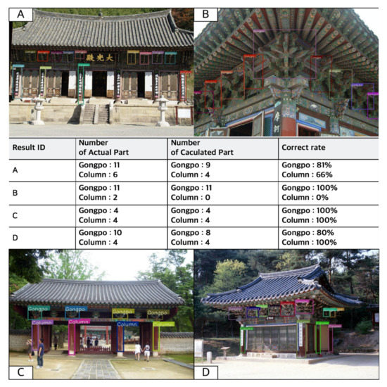 Images clearly showing gongpo and columns that were not included in the training process were used to test the model trained with YOLO. Before the model was tested, the structural members within the overall layout of the building shape needed to be classified, and their location needed to be displayed in the images. Having the model find features was more difficult than classifying structures by country. Moreover, the COCO dataset normally used for YOLO consists of more than 60,000 data; however, only 16,478 images were used in this study, so the model had quantitative limitations. Consequently, the model showed an accuracy of 73.04%. As shown in Figure 15, the model trained with YOLO was applied to traditional buildings that were photographed with mobile phones [25]. Four images showing typical major features are presented. The model performance showed a high correlation between the main features and composition in the masking step. Objects could not be detected because of the angle at which the photograph was taken or when they had a low degree of exposure. In A and C, the structural members of the facade were generally well detected. In A, four of six columns were detected and had their locations displayed despite being covered in script. In B, however, even though all gongpo were recognised, the columns could not be recognised at all when only a small portion was visible. Gongpo at the corners of A and D were not detected successfully because they were not close enough to the camera as in B. In the future, masking must be performed for object recognition to overcome these detection blind spots.