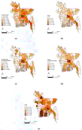 District-wise maps of the present situation of the COVID-19 pandemic in Bangladesh as of 25 May 2020. (a) Number of Confirmed Cases, (b) Number of Deaths, (c) Number of Confirmed Cases per 100,000 population; (d) Number of Deaths per 100,000 population, (e) Case Fatality Rates.