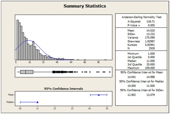 Figure 1 implies that the analysed data does not fulfil the assumption to confirm the hypothesis on normality of the statistical set (p-value < 0.05). Thus, it may be stated that the data distribution is not normal (we accept an alternative hypothesis). This can also be seen in the measures of kurtosis and skewness (Table 1). A significant mismatch in the area of the normal data distribution can also be seen in the comparison of mean and median measures, which differ considerably. Currently, the set comprises many extremes as well as individual groups which, however, do not contain many measures, and pursuant to the conducted Thompson Tau test, in the case of extremes, there is no assumption they would misrepresent the achieved results markedly; on this basis, it is possible to leave them in the statistical set. Since the skewness of the distribution is too big, the standard deviation will not provide sufficient information on the scatter of individual data in the statistical set.