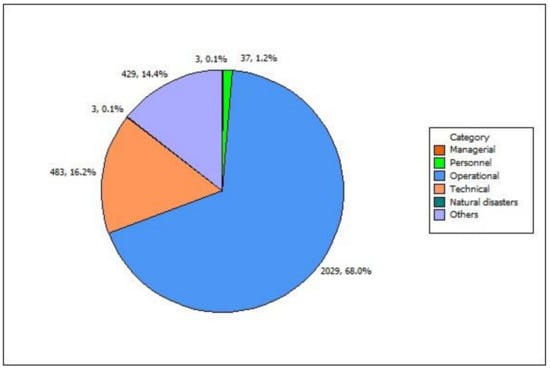 The categorization of risks has been created by a method of observation by experts in cooperation with the transport division of a manager of railway infrastructure, and the marketing section and the internal audit division of the ZSSK carrier []. Risks have been categorised to operational, technical, manager, personal risks, natural disasters and other risks. This categorization was based on detailed daily data collection of railway operation recorded in the Microsoft Excel for the observed period from 2015 to 2018.