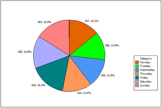 Due to time irregularity, the research [,,,] introduce a phenomenon of different results of delays by weekdays. Usually, the most frequent delay of trains can be observed on Fridays and Sundays. On these days, extra trains are operated, i.e., there is a higher number of trains which may be routed with regard to the throughput of line sections, however, at the same time in accordance with higher requirements of customers. Also, the number of wagons arranged in trains is bigger, which may cause higher demands on the train operation and more challenging situations on platforms when the passengers get on and off. Based on the experience of railway undertakings, a higher frequency of passengers can be monitored on these days. In particular, it is caused by the return of people who work or study away from their place of residence and commute to work. On the basis of the information above, the following research hypothesis was formulated: