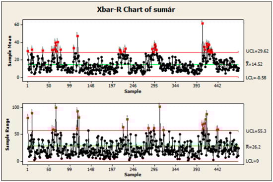 Since the value that the control chart is plotted for is measurable, we may use a control chart of means and ranges, a control chart of means and standard deviations, and a control chart of individual values. Since the values LSL (0 is the most favourable situation for the carrier when the train is not late) and USL (5 min.—a limit acceptable to the infrastructure manager) are provided, there was research conducted to find out how the measured values differed from the monitored ones (based on ISO 8258 standard—Shewhart control charts).