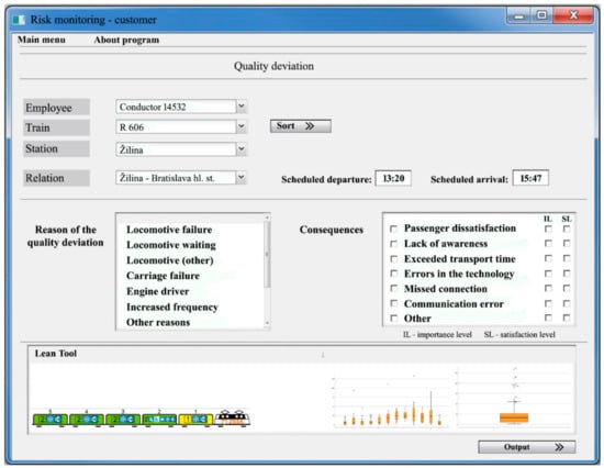 Lean tools are supplemented by the authors’ proposed method of calculating the quality of service in the transport phase. In the next step, this calculation is implemented in new software improving the approach to risks with the involvement of employees and customers. The infrastructure manager did not use these tools and preventively monitored the risks that need increased attention, as it is the most important international corridor of passenger transport. The proposed software solution, which can be used in the V4 countries, also contributes to the originality of the processed benefits. The passenger transport carrier records delays in Microsoft Excel; furthermore, neither the prevention nor the efforts to eliminate risks in the future are addressed in many cases [].