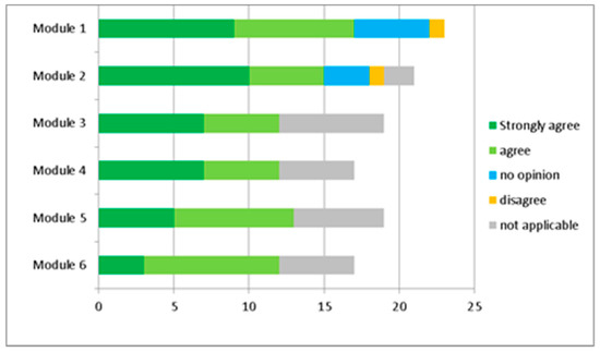 Figure 6 represents a comparative overview about of participants’ perception of their level of learning in each module.