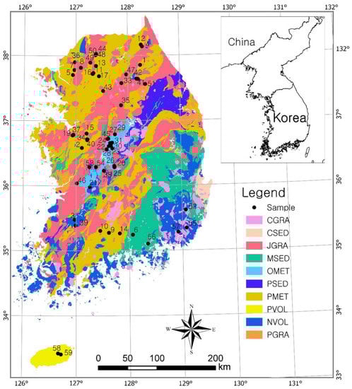 Although the geology of Korea is relatively complex, it can be divided into 10 geological units [3]. The 59 bottled water companies are located in areas corresponding to five geological units to ensure favourable water quality for drinking water, most of which are crystalline metamorphic rocks and igneous rocks (Figure 1). Among these, Precambrian metamorphic rocks (PMET) consist mainly of gneiss and granite gneiss. Ogcheon metamorphic rocks (OMET) are composed of metamorphosed sedimentary rocks with ages ranging from Precambrian to Palaeozoic. The main constituent rocks of OMET are schist, phyllite, crystalline limestone, and slate. Jurassic granite (JGRA) is reported to have formed from magma originated from sedimentary rocks (S-type granite). However, the Cretaceous granite (CGRA) was derived from the partial melting of the mantle (I-type granite). Porous volcanic rocks (PVOL) consist of Quaternary basalts characterised by rapid movement of groundwater [13].