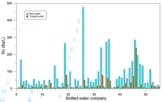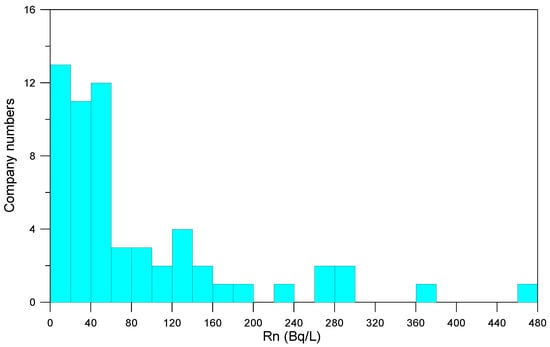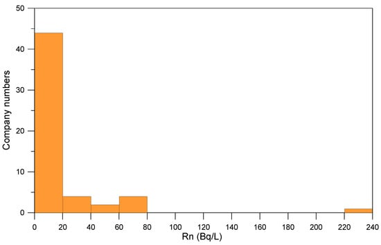The radon concentration frequency distribution of the treated water is shown in Figure 5. Among the 55 raw water samples, company 50 produced water with a concentration exceeding 148 Bq/L (284.9 Bq/L). The radon concentration in the treated water of this company remained high at 239.4 Bq/L. The treated water of company 50 exhibited a low radon reduction rate, mainly because the company did not use GAC filters and had a high bottled water production rate. Generally, it takes 1–2 weeks for bottled water to reach the store in Korea; hence, it is expected that the radon concentration in the bottled water produced by company 50 will be lower than 50 Bq/L when the bottles are purchased by consumers.