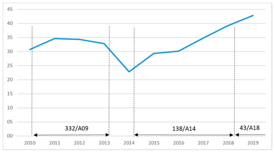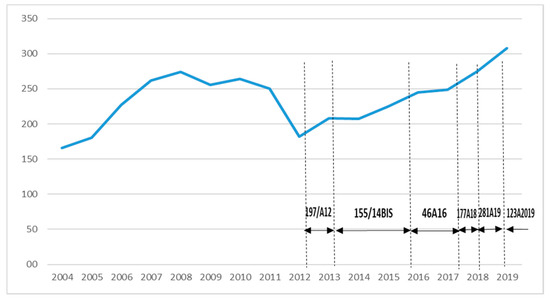 Thousands of passengers carried yearly on the PSO air route ES23 (as of 31 December 2019). Source: Own elaboration based on [21,22]. Explanatory notes: Each arrow denotes a contract period for PSO type 3 with case number concerned; the area without an arrow denotes a period of activity without any economic compensation (type 1 or 2), or failing this, under free market conditions; the case 162A2020 has not been mentioned on the graph because this is an ongoing contract since 1 January 2020.