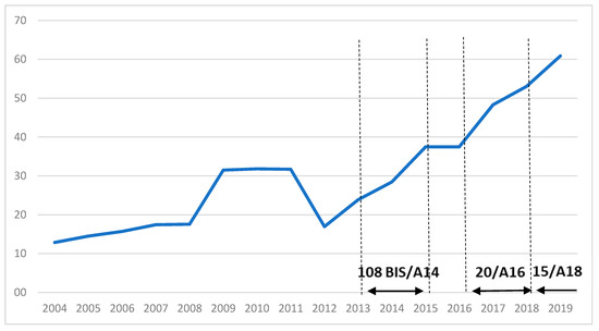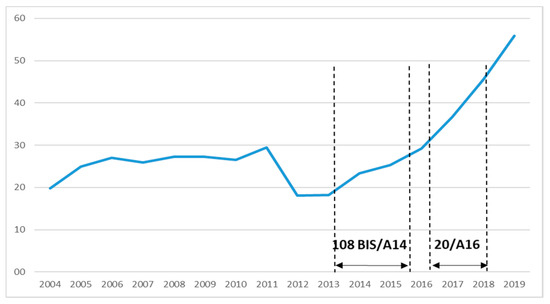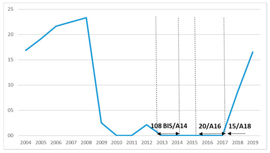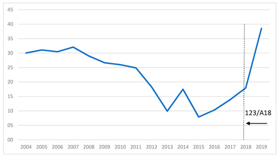 The imposition of PSO on scheduled air services serving the region of Extremadura has led to an increased demand for fights from Badajoz airport since the corresponding public contract was awarded by the national government’s Ministry of Public Works. Traditionally, such regional airport infrastructure has been underused in operating regular air services for the carriage of passengers, particularly in the case of international flights. However, the existence of the Spanish air force base, located near the civil airport terminal, appears to have had a considerable impact on keeping the entire infrastructure lively and active, despite a significant drop in the number of passengers carried until the summer of 2012. Currently the public air transport network from this airport comprises two routes linking Badajoz to the two largest Spanish cities, Barcelona and Madrid. Although the route BJZ–MAD was operated under free market conditions, none of the airlines operating this route were able to make these air services profitable or reliable, which resulted in both UX and YW ceasing their operations at Badajoz. In view of the sudden lack of supply of these flights, the route was converted into a PSO route under type 3, and therefore an e-procurement procedure was carried out for the tendering of a service contract (123/A18), which remains currently in force since 28 October 2018. Thanks to diligence and flexibility in the resolution of an e-procurement procedure related to awarding the tender for this PSO case, as seen in Figure 7, there has been a significant increase in the number of passengers carried on this route. All of this has led to the CAGR of 0.14% within the period between 2004 and 2019, in addition to a budgetary saving of EUR 1,750,000 from the e-procurement process for the contract 123/A18.