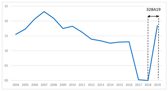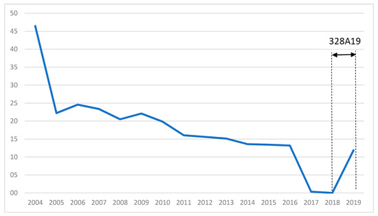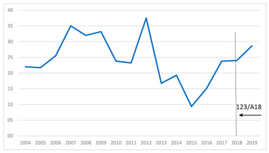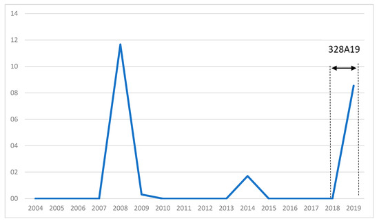 This air route MLN–LEI is a part of the PSO network broadly based in the city of Melilla, an autonomous city under Spanish sovereignty, whose objective is to serve the local population in addition to those living within a large catchment area located in the northeastern region of Morocco. Historically, this air corridor has had a greater economic component, being strongly linked with trade relations between Melilla and mainland Spain. Moreover, Almeria being the nearest gateway from Africa to trans-European road networks, scheduled air services on the route have played a vital role in enhancing connectivity among people living on both sides of the Mediterranean Sea, particularly for those visiting their relatives in the summertime. Although this route has reaped the benefit of the Spanish resident subsidy (formerly 50%, currently 75%) for those living in Melilla, the number of air passengers has been dropping steadily since 2004. Nevertheless, upon the 328A19 public contract award, the imposition of a PSO has led to a revival of flight demand. As can be seen in Figure 9, this seems to be growing substantially again.