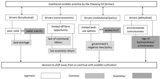 In many parts of the developing tropics, smallholder swidden farmers are now transitioning from traditional rice or maize-based farming system to more permanent sedentary agriculture or cash crop-based systems [35,36]. Such transition, however, does not follow a fixed pattern and usually occurs as a consequence of interplays and interactions between several biophysical, socio-economic, and institutional factors [37,38,39]. The government’s land-use policy and major focus on conservation also make swidden agriculture particularly challenging in many parts of south and Southeast Asia [2,15]. Low productivity of swidden attributed to drought and water scarcity, losses in soil fertility, soil degradation as well as market constraints also making this age-old land-use highly vulnerable in the region [40].