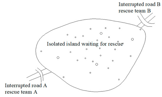 In this paper, the term isolated island refers to the non-accessibility of the disaster area from the outer area. The non-accessibility occurs because the roads connecting to the disaster area are broken. The repaired road is uncertain because of many uncertainties, such as assessment of the damage and availability of resources. We assumed that the island is connected by two roads A and B, which need repair after the disaster. If interrupted road A is first repaired while interrupted road B is still in maintenance, rescue team A has to consider how to cooperate with rescue team B in the uncertain environment, as shown in Figure 1.