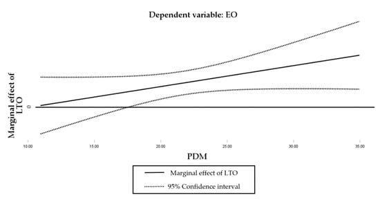 Nevertheless, it might be the case that the interaction effect is not significant between certain values of the moderating variable and strongly significant for another range of the moderating variable [25,127]. For example, it might be possible that family firms require a minimum level of PDM in order for an LTO to support EO. Therefore, we performed an additional analysis where we calculate the marginal effect of LTO on EO. As can be seen in the following equation: